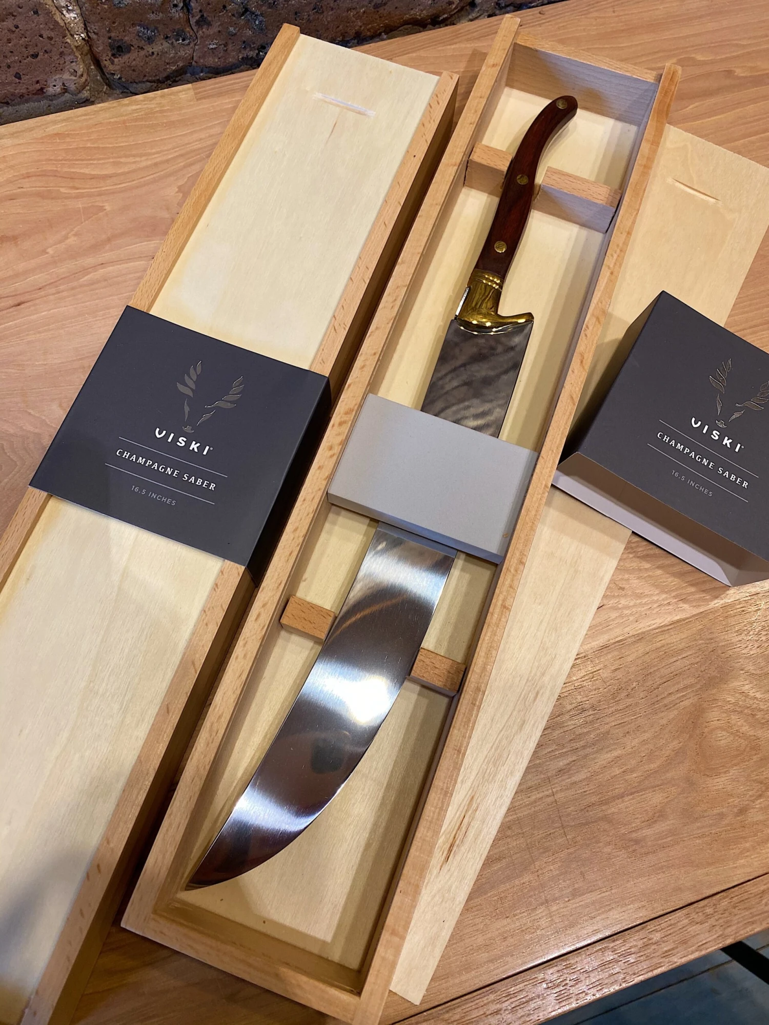 Champagne is meant to be savored – and occasionally sabered. Rooted in 19th century French tradition, the elegantly curved champagne saber slashes through bottles with ease – without the added danger of a standard saber’s edges.—Curved Stainless Steel Blade–Polished Wood Handle–16.5 in. In Length–Packed in Lightweight Wood Box–