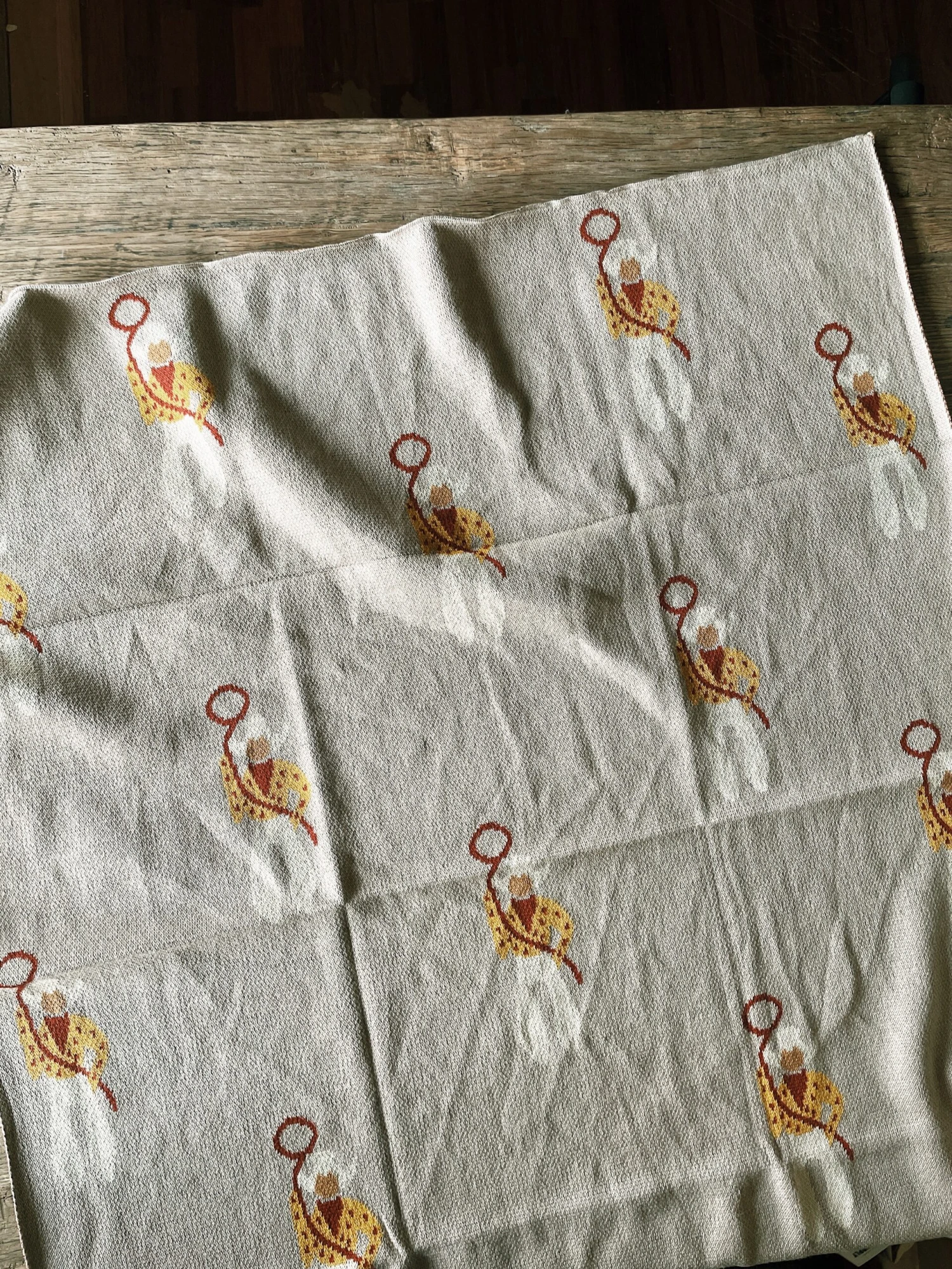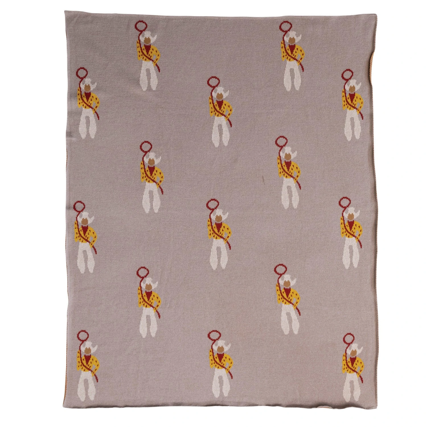 Tan blanket with cream, yellow, and red cowboys