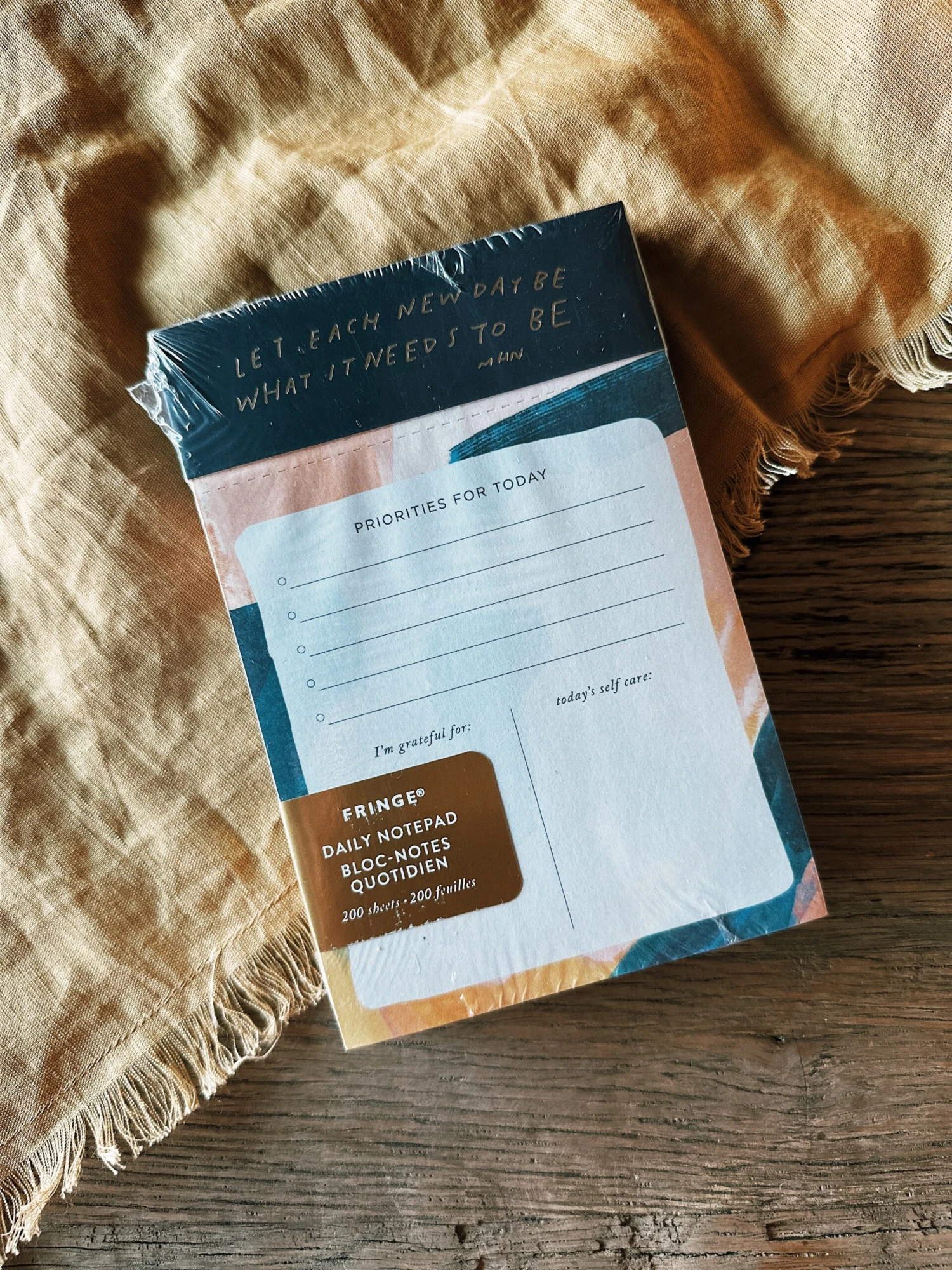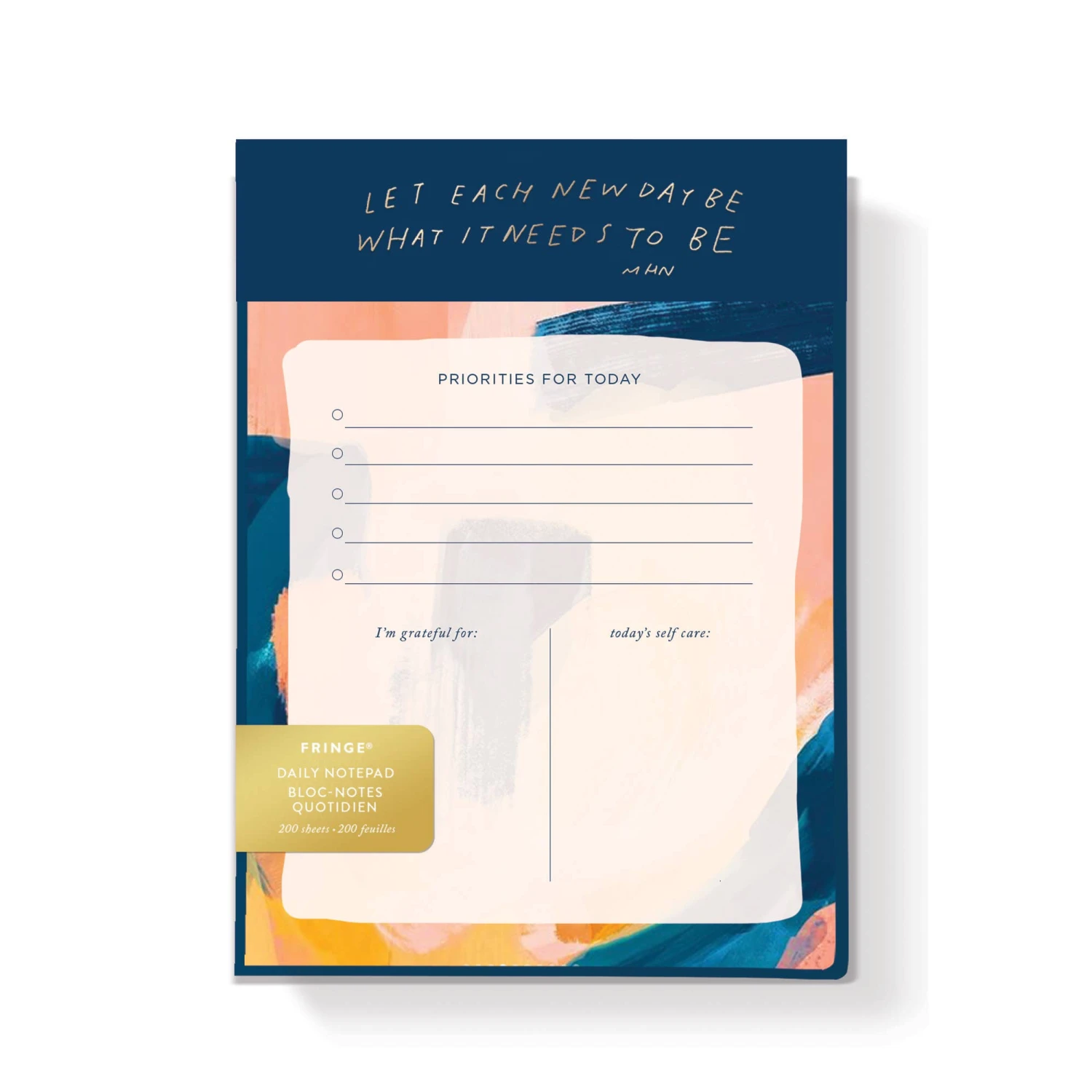 Gold foil accented header and colorful sheets with prompts for managing daily tasks, priorities and thoughts of gratitude. Features artist collaborated design by Morgan Harper Nichols. Deskpad measures 4” x 6”, shrink wrapped with gold metallic marketing label- 200 perforated sheets.