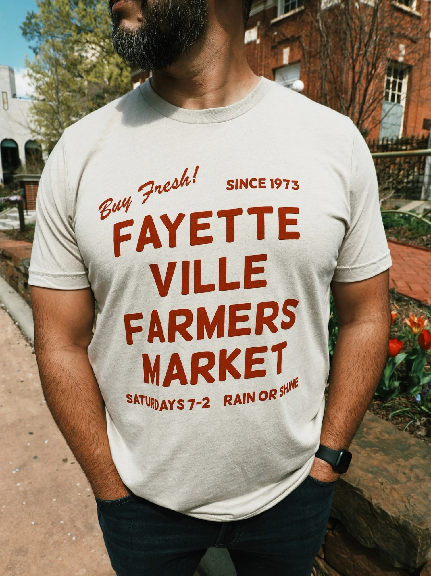 This super soft tee is perfect for your next trip to the Fayetteville Farmers Market. The light tan tee has red ink that says “Buy Fresh! Since 1973 Fayetteville Farmers Market Saturdays 7-2 Rain or Shine.”