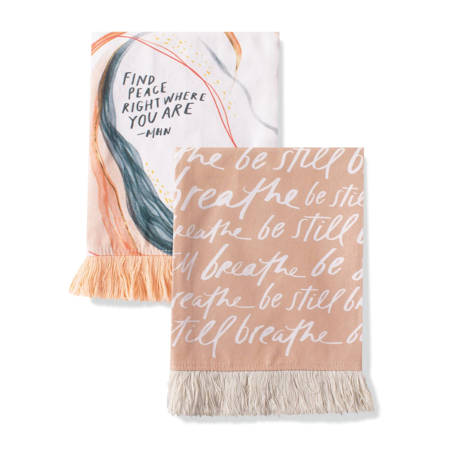 100% cotton decorative tea towel sets of 2. Tied together with cotton twill ribbon and hang tag. Hand wash and line dry recommended. 18” x 28” tea towels are not gift boxed. Features artist collaborated design by Morgan Harper Nichols.