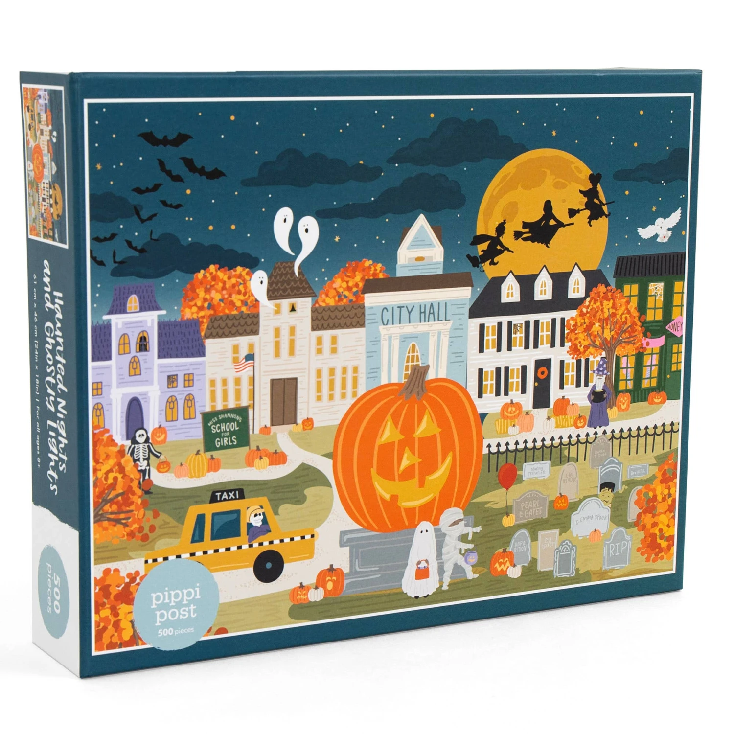 Our Haunted Nights & Ghostly Lights puzzle is the perfect Halloween activity! A great gift for the spooky-season lover or pop-culture fan, this 500 piece jigsaw puzzle features scenes from all your favorite magical stories. Explore the Halloweentown square, complete with City Hall, the Jack-o-Lantern Pumpkin, and Taxi Cab driven by Benny the skeleton. Piece together ghost and mummy trick-or-treaters outside the town cemetery featuring graves, Frankenstein, and Pennywise’s red balloon. And discover a night-sky fright with a full moon, the Sanderson Sisters on broomsticks, a trio of ghosts, and Harry Potter’s white owl, Hedwig. Uncover even more in this spooky town with an puzzle that’s sure to be a favorite every October!