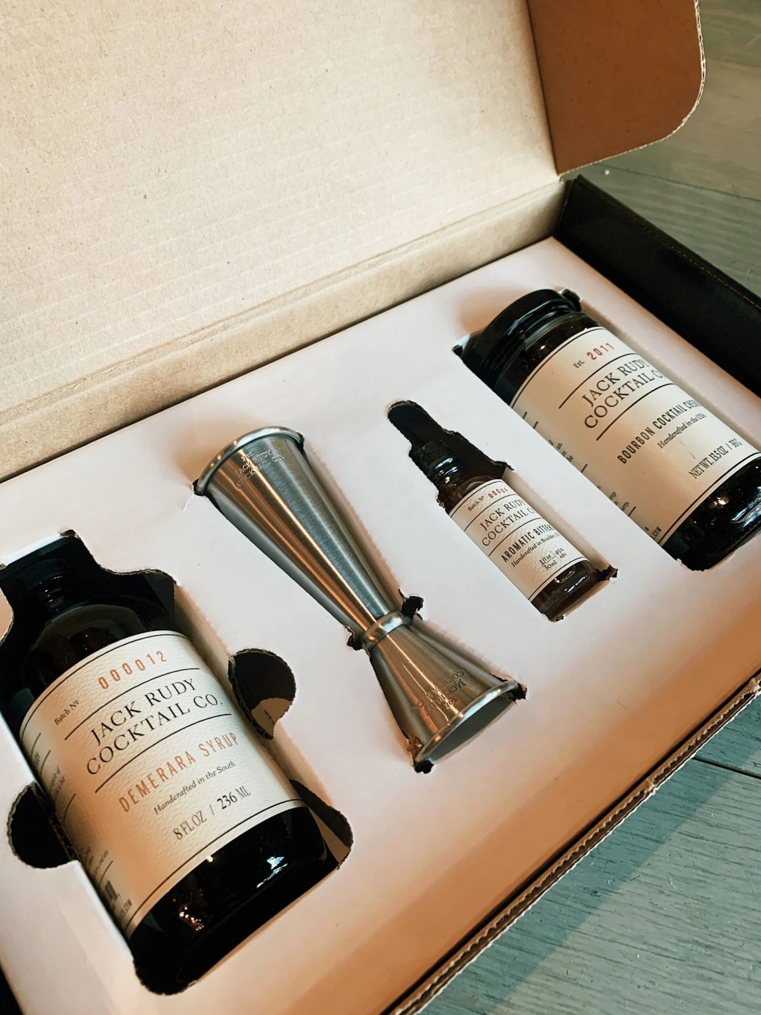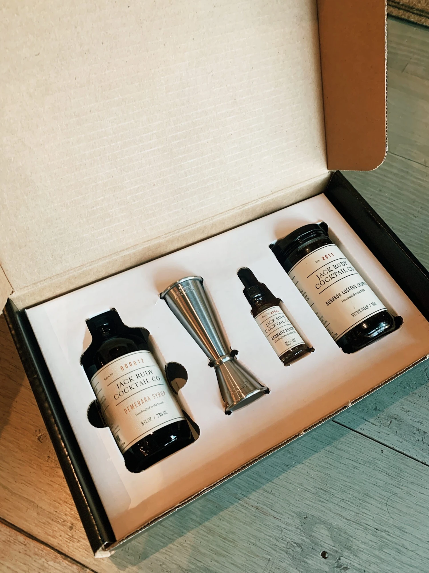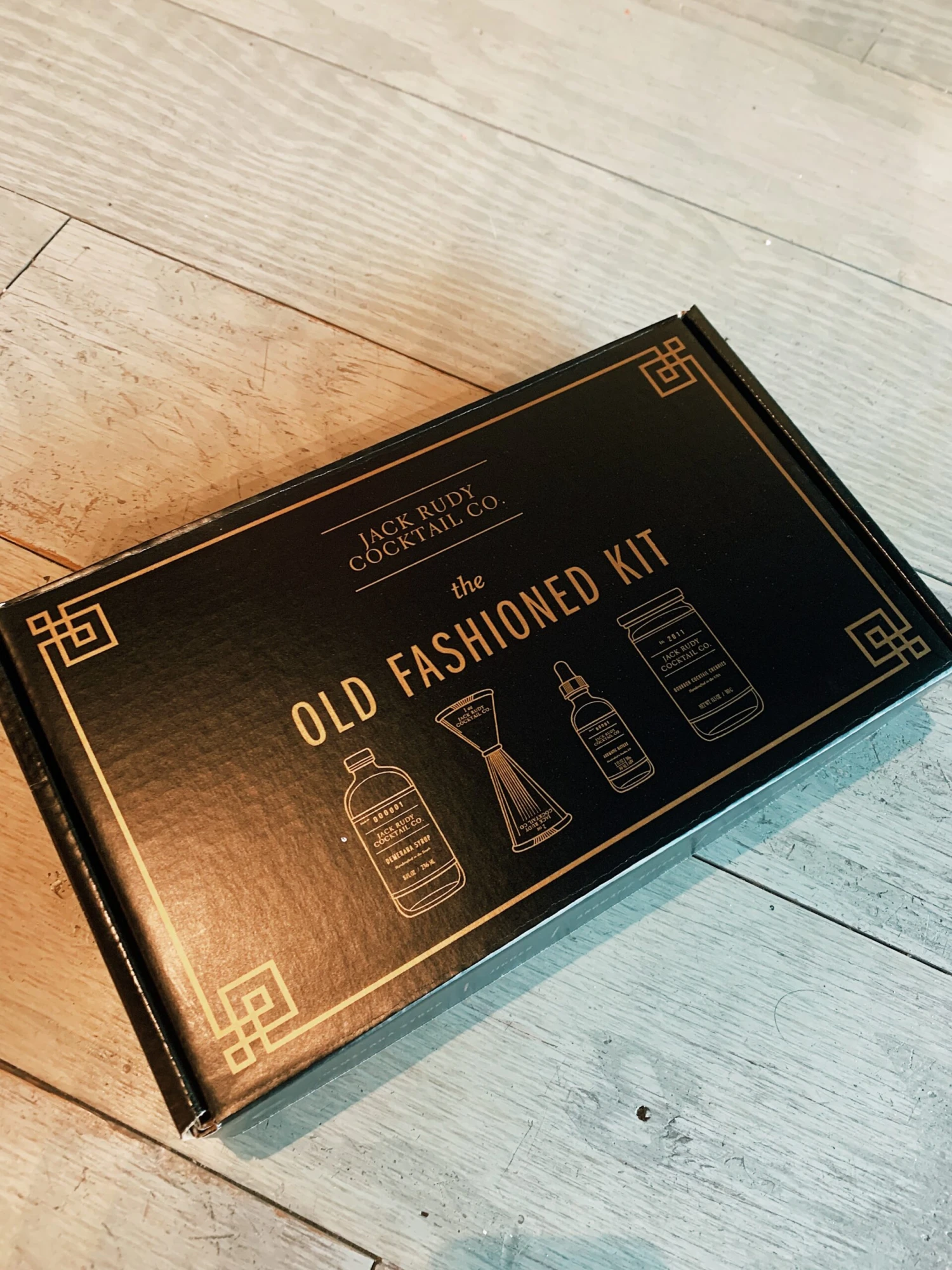 The Old Fashioned Kit includes an 8 oz. bottle of our Demerara Syrup, an 8 oz. jar of our Bourbon Cocktail Cherries, a 1 oz. bottle of our Aromatic Bitters, and a Graduated Jigger. These small batch products are packed in an elegant black gift box perfect for holiday gift giving, as a housewarming gift, or a bar starter set for home and professional bartenders alike.