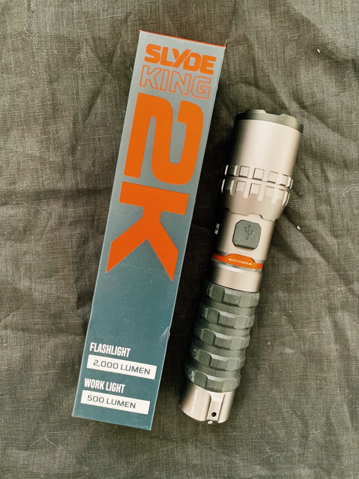 New and improved, and still the KING. Rechargeable, waterproof (IP67) and extremely versatile, the SLYDE KING 2K features a 2,000 lumen flashlight with 4x zoom, and a 500 lumen C•O•B work light. Each light mode is dimmable with programmable memory. The SLYDE KING 2K also has an ergonomic rubberized grip and powerful magnetic base.