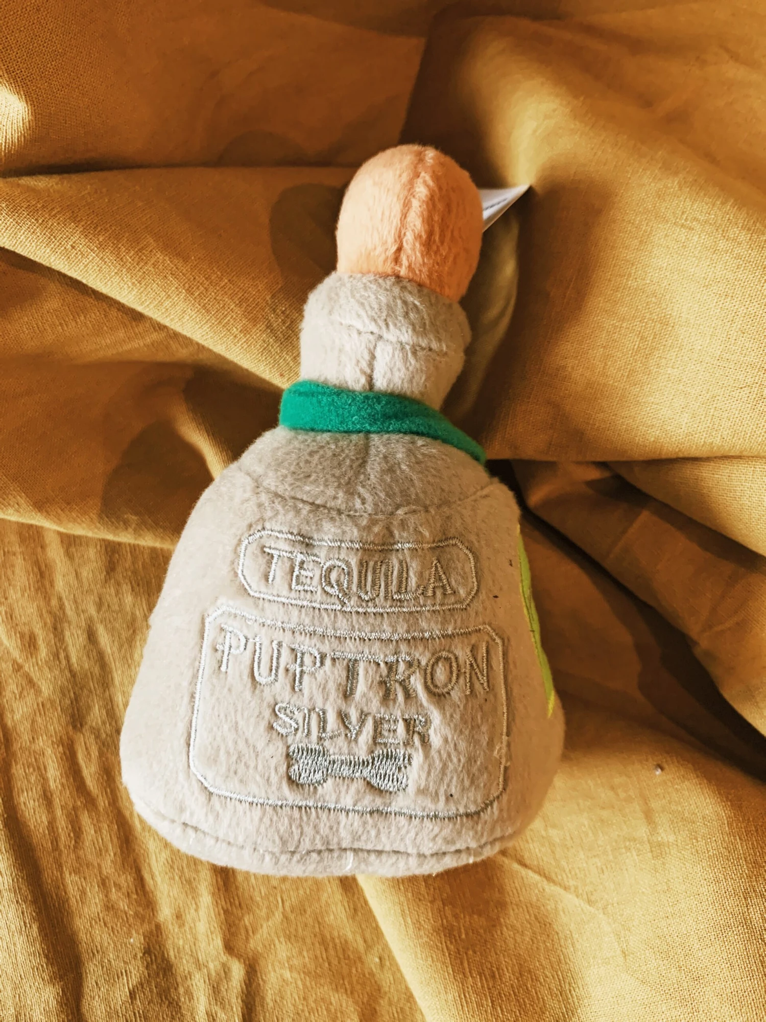 Puptron silver tequila bottle dog toy is made of soft plush material and has a squeaker inside. Your dog will love this fun and unique toy.