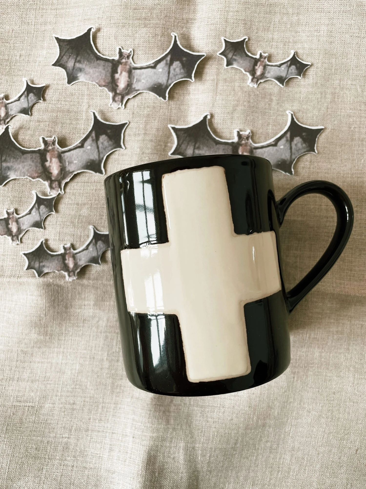 3″ Round x 4″H 8 oz. Handmade Stoneware Mug w/ Wax Relief Swiss Cross, 4 Colors (Each One Will Vary)