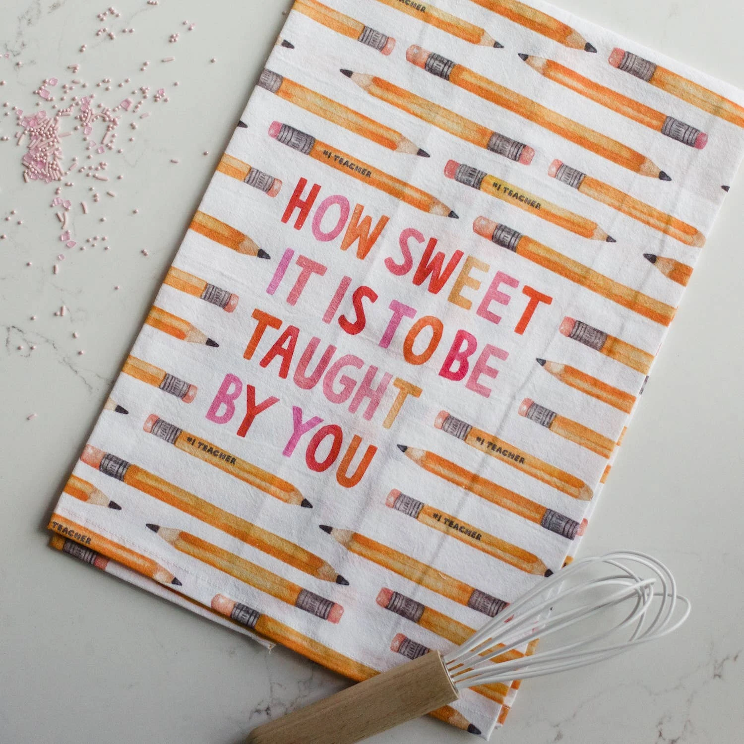 Looking for a cute teacher gift? This teacher sweetness tea towel features hand-illustrated pencils and the words “how sweet it is to be taught by you”. This thoughtful tea towel works for teacher appreciation gift, teacher Christmas gifts, end-of-the-school-year gifts, back to school gift, or just because teacher gifts.