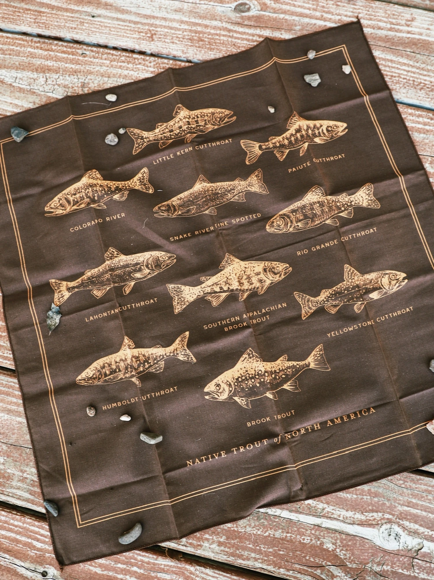 A bandana featuring illustrations of trout native to the United States, including Southern Appalachian Brook Trout, Yellowstone Cutthroat, and Colorado River Cutthroat. The Wild Wander bandanas are proudly illustrated and printed in Virginia on a 100% cotton bandana made in the United States. These make the perfect accessory for you or your four legged friend’s next wander.