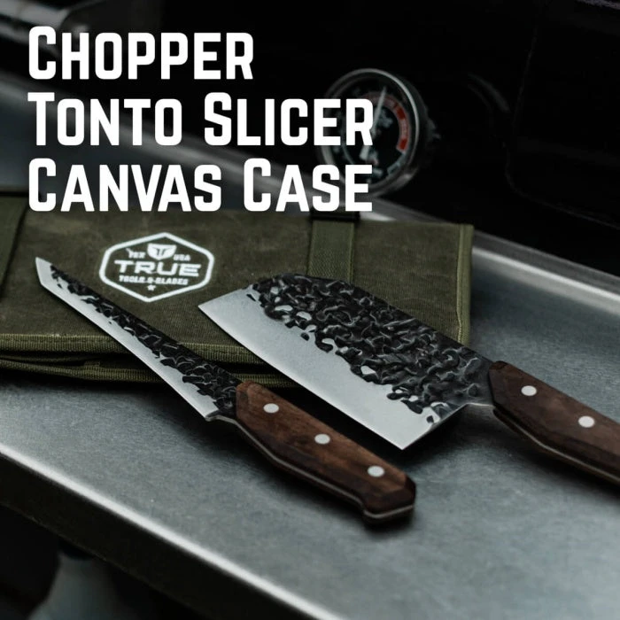 Stop using kitchen cutlery for a grill masters’ job! The TRUE PrimalForge™ kit was made with your grilling and wood-fired smoking obsession in mind. The set includes one PrimalForge™ Chopper Knife, one PrimalForge™ Tanto Slicer Knife, and a waxed canvas storage roll that is reinforced with slots to keep your knives organized until your next cookout.