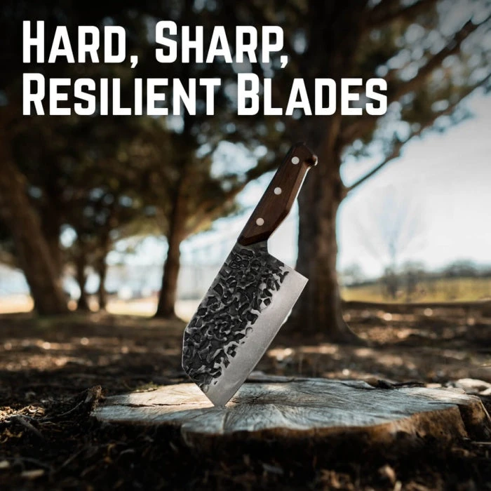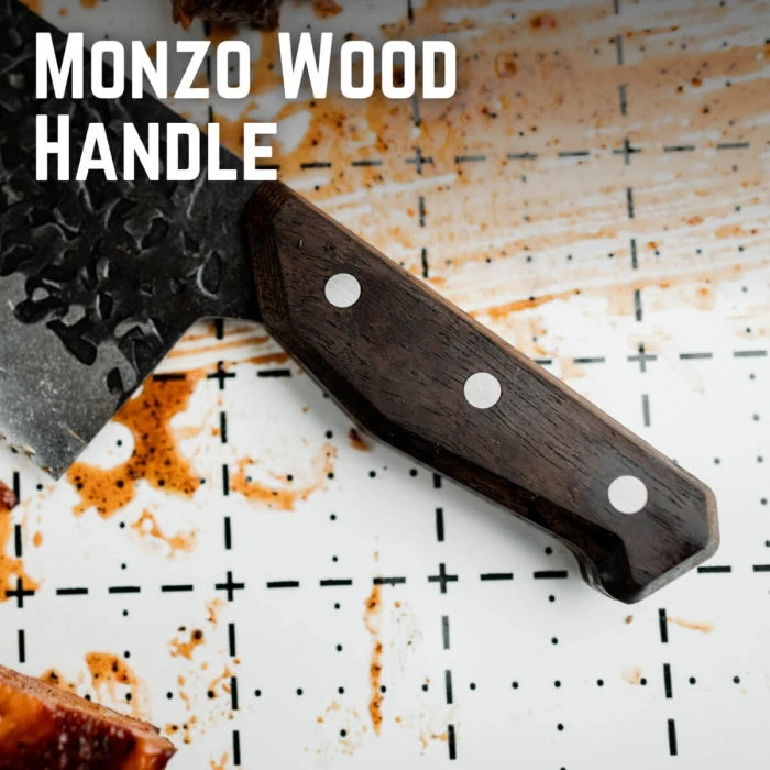 Carve, chop, cut, and slice with ease as you prepare steaks, ribs, tri-tip, brisket and more using knives that are up to the task. The hefty handles feel great in your hand and are made of real Monzo wood, known for its’ dense hardness and water-resistant properties. The sturdy, stainless-steel blades are are unapologetically unrefined yet razor sharp and easy-to-maintain with full tang construction that ensures long-lasting durability.Â