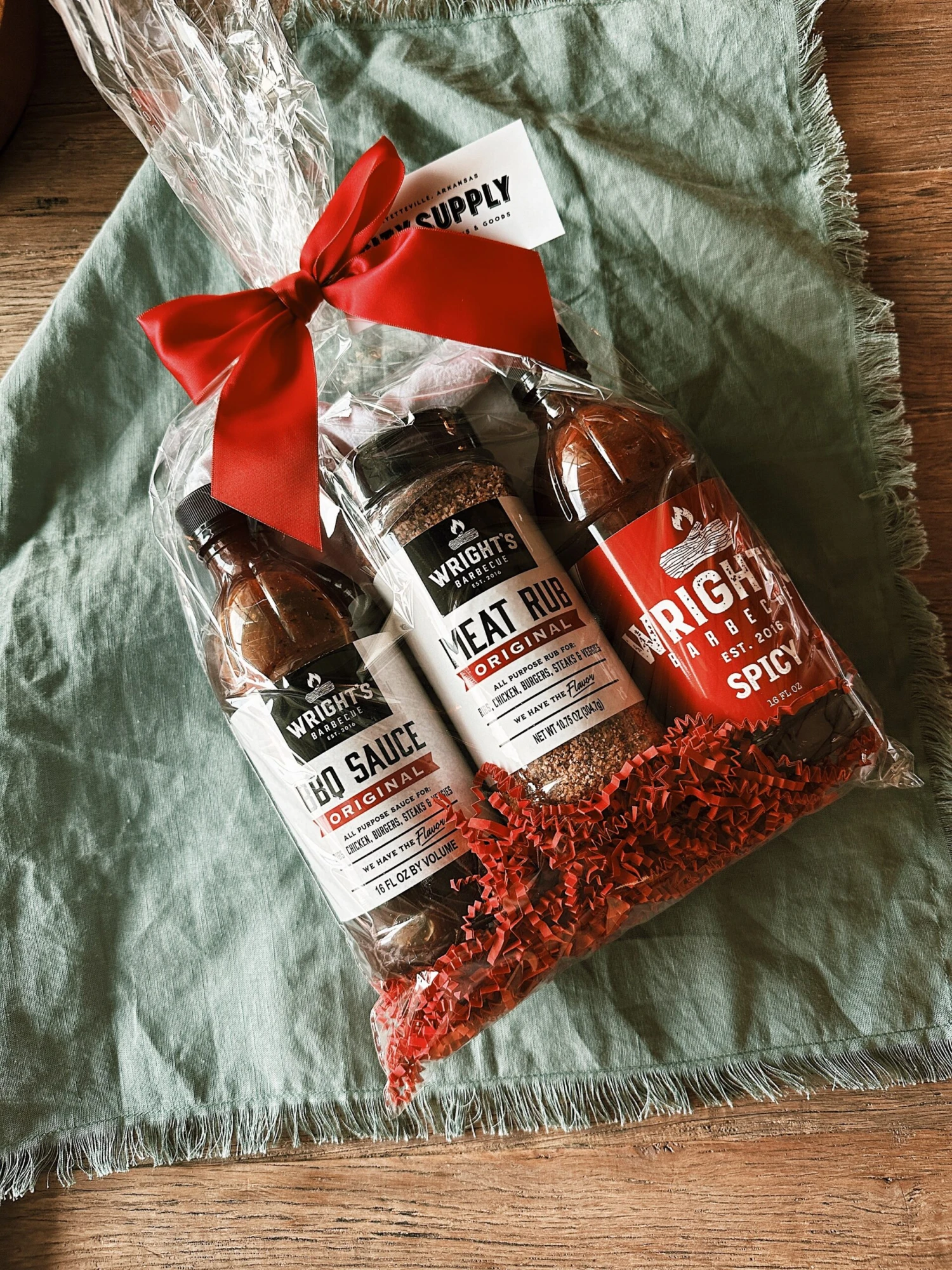 The Ultimate Wright’s Gift Set includes our top three products from Wright’s Barbecue and our City Supply exclusive BBQ Pig tea towel. Each gift set comes wrapped in cellophane bag with a ribbon.Â