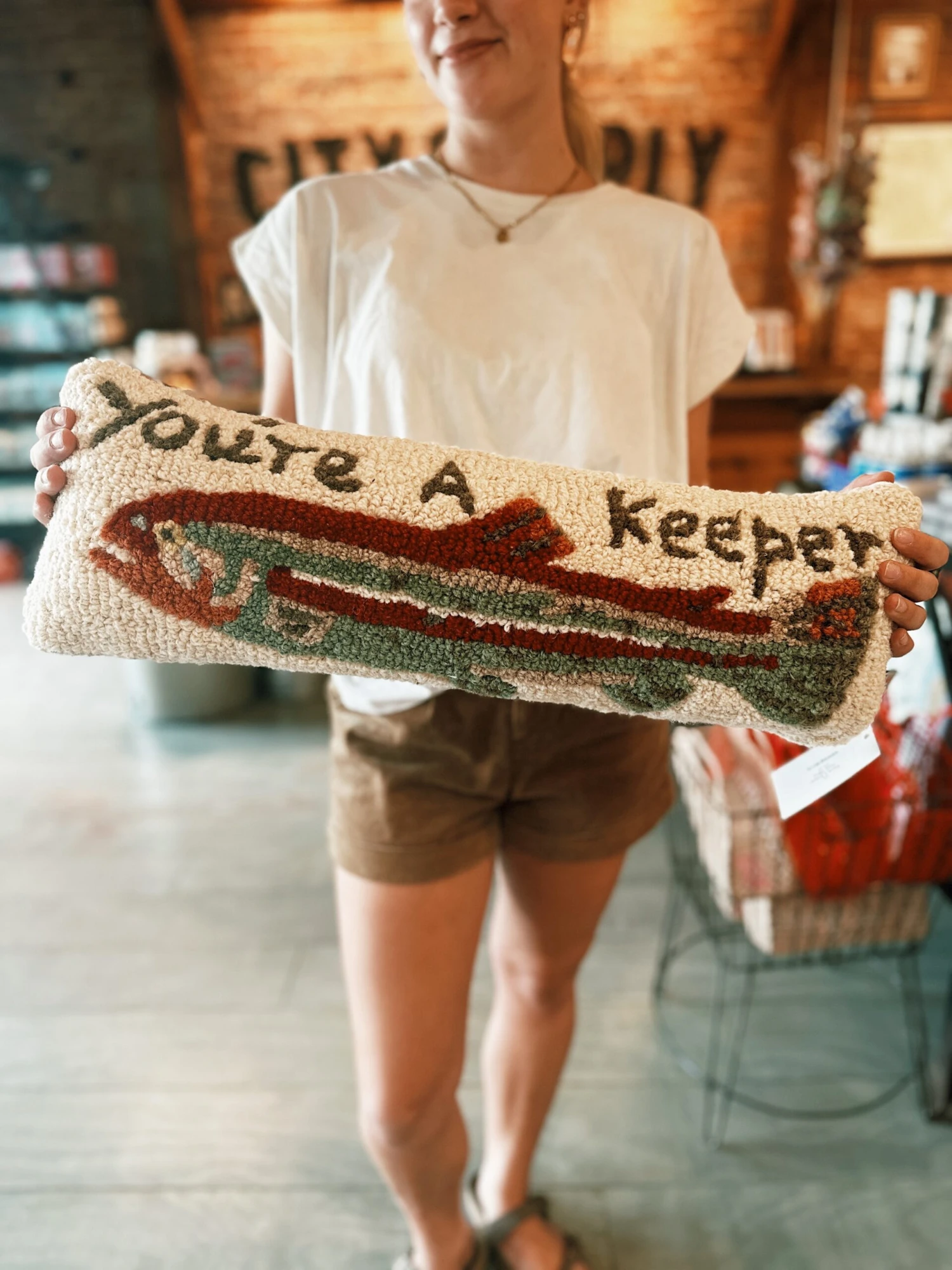 8″ x 24″ hand hooked pillow, made with 100% natural wool. Zippered velveteen backing with poly-fill pillow insert. Designed in Vermont by Laura Megroz.